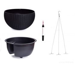 RATAN AQUARIUS - SAMOZAVLAŽOVACÍ ZÁVĚSNÝ XL KVĚTINÁČ s ocelovým lankem na zavěšení, imitace ratanu, se samozavlažovacím systémem a vyjímatelnou vložkou, ve spodní části vypouštěcí ventil.